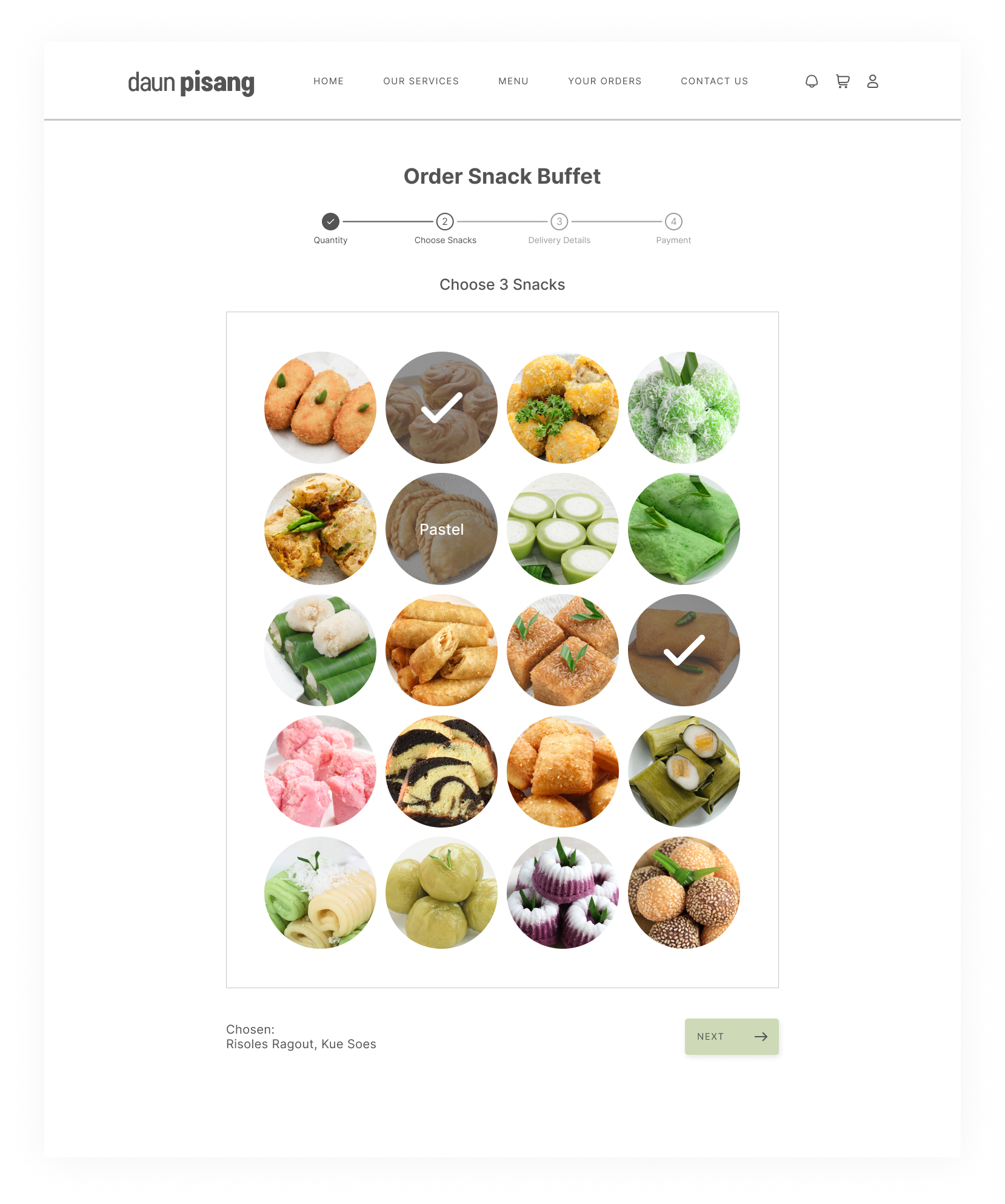 The second step is choosing the types of snacks users need. Displaying the snack thumbnails in round shapes is giving a bit of 'playful' mood, making this step seems like an amusing experience. Users are required to choose snacks as many as they requested in the first step.