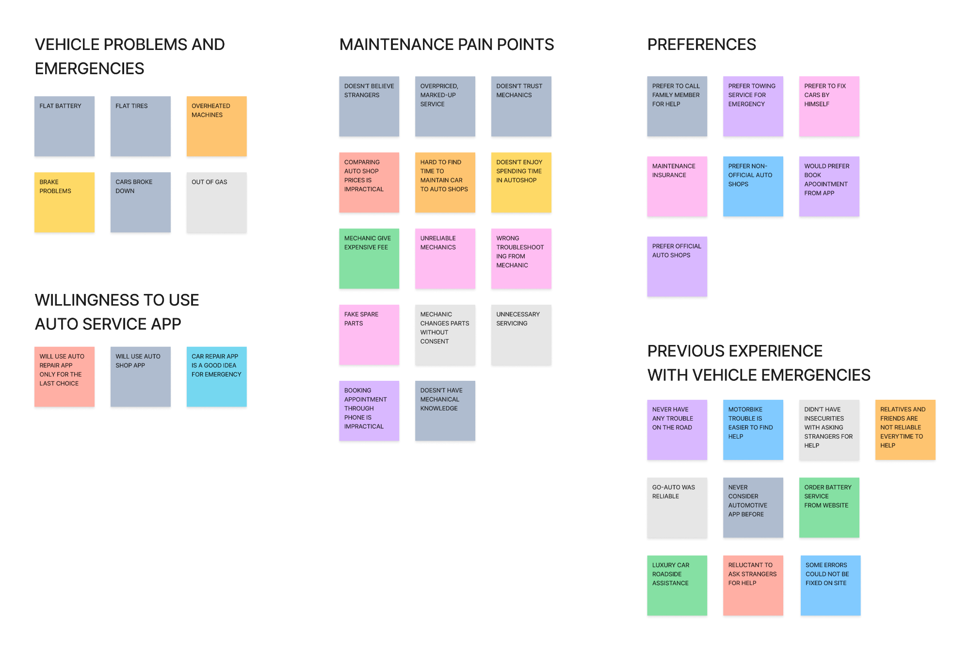 I use the affinity mapping method so I can get a clearer version of the insights I got from the interviews and divide them into categories.