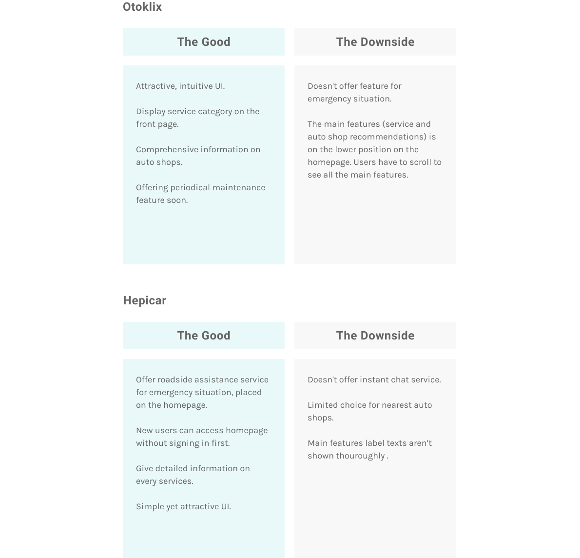 Competitive analysis has assisted me to see what’s already out there, and are my target users using it, and what features are not offered to to the market yet. It actually gives me the big picture of what a car maintenance app looks like.