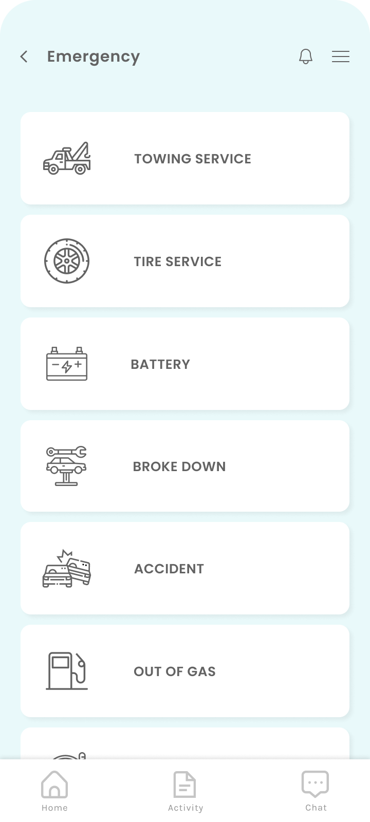 - Under 'Emergency' page, place the 'Tire Service' and 'Battery' on the top because flat tires and batteries happens more often that other vehicle problems.