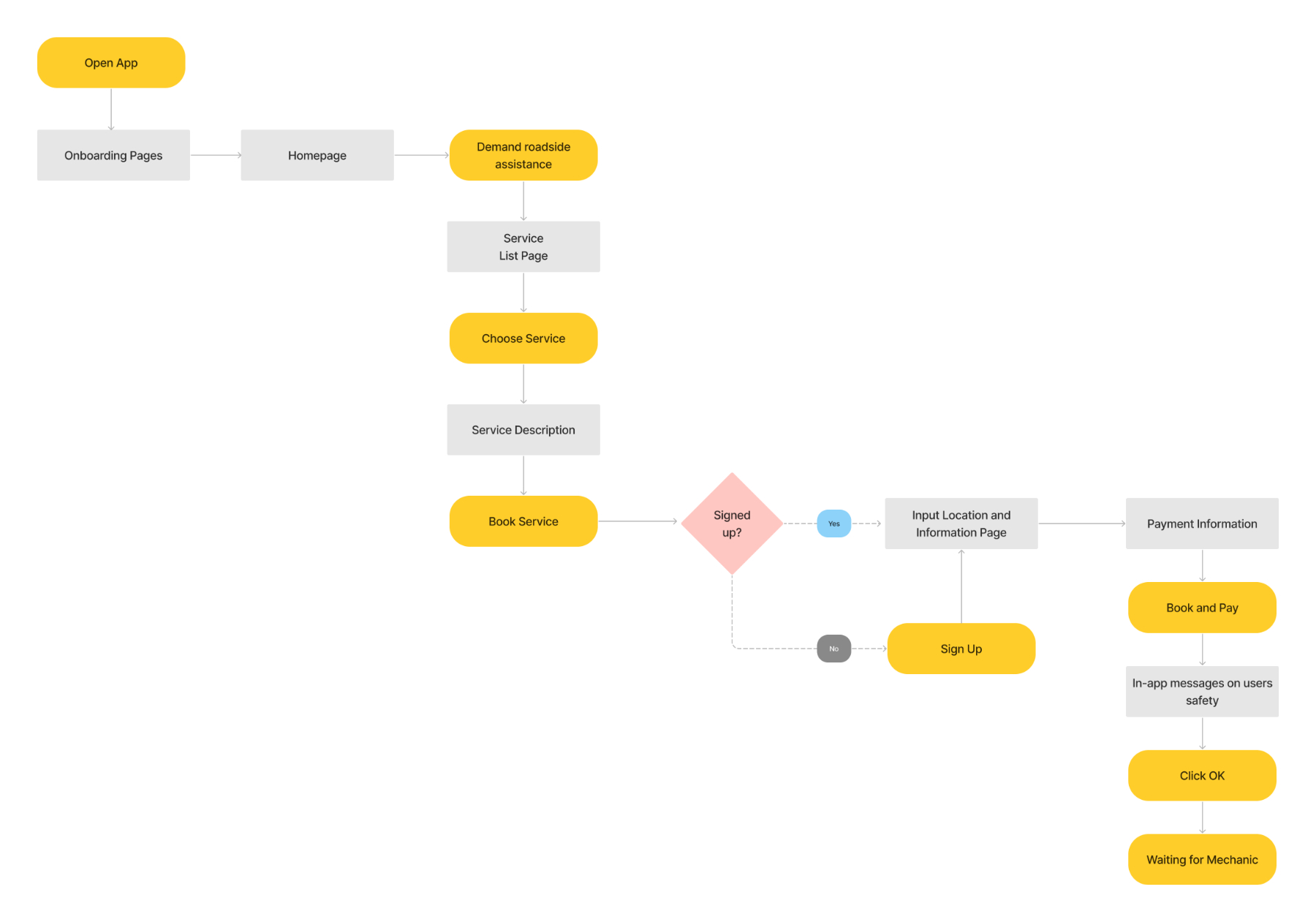 First impression matters, I believe. That’s why in this user flow, the most critical point is the onboarding experience, or when new users are directed to the homepage to start exploring our services. To optimize the onboarding experience, we allow new users to enter homepage directly. To allow new users to start using the app before signing app is one way to offer them easiness in the midst of chaos .