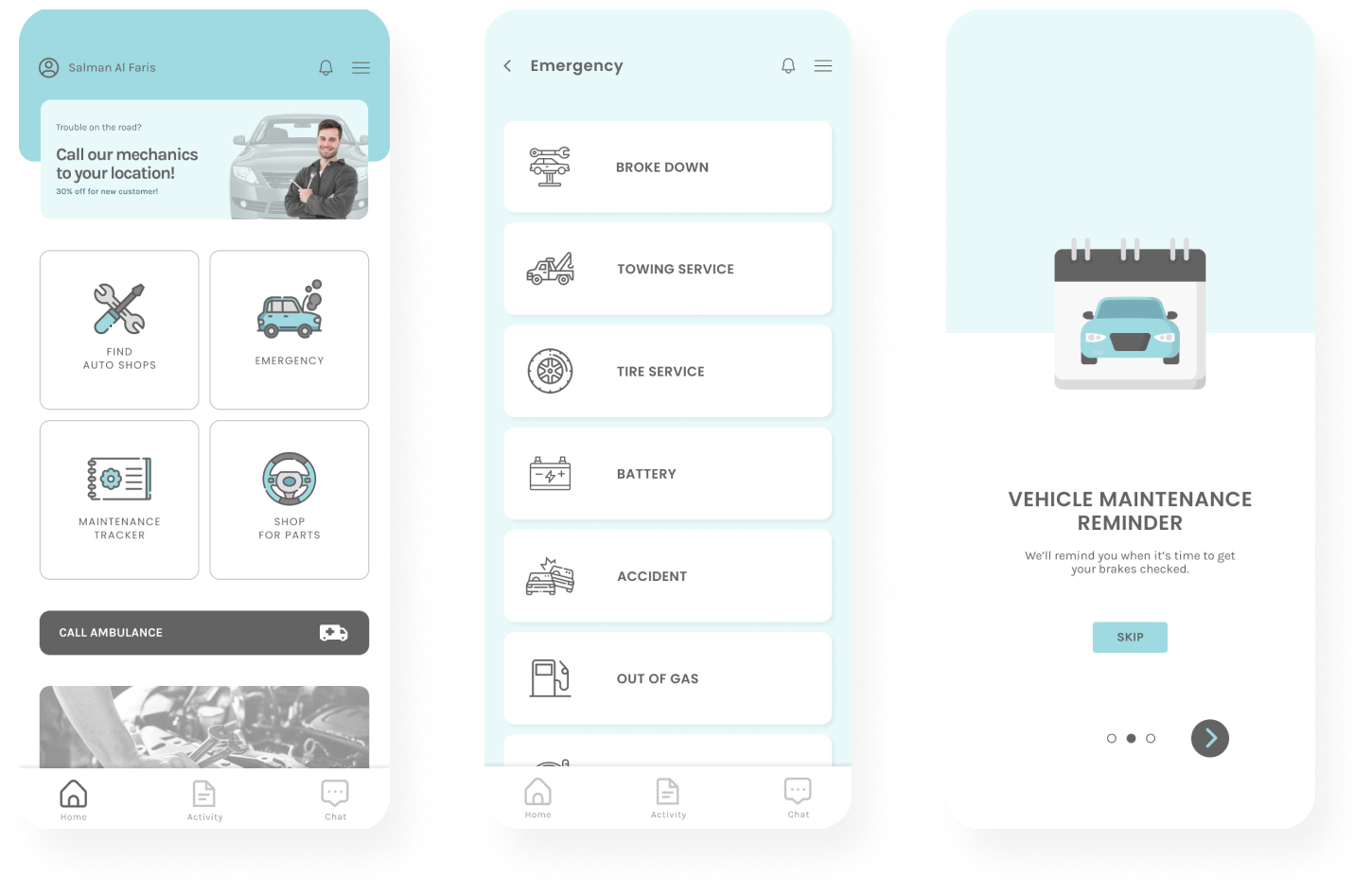 The objective of blue color in this app is to give a little sense of calm in the middle of agonizing situations. I tried to minimize any unnecessary options and UI components because angry and panicking users don’t feel like finding roadside assistance features on a crowded screen with tiny, scattered texts and buttons.